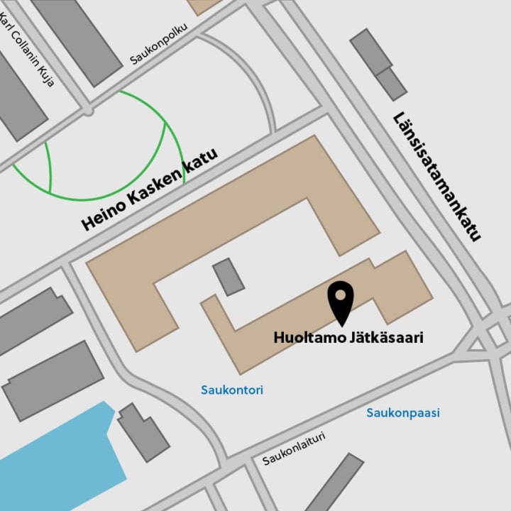 Heino Kasken katu 4 D, 00180 Helsinki. Toimimme Huoltamo Jätkäsaaren viihtyisissä tiloissa. Meille pääsee helposti niin julkisilla kuin omalla autolla. Kiekkopaikkoja löytyy vastapäätä liiketilaa ja lähin ratikkapysäkki noin 130 m päässä.